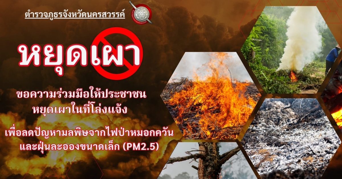 ตำรวจภูธรนครสวรรค์ และ สถานีตำรวจภูธรลาดยาว ขอความร่วมมือให้ประชาชน หยุดเผาในที่โล่งแจง เพื่อลดปัญหามลพิษจากไฟป่าหมอกควันและฝุ่นละอองขนาดเล็ก PM 2.5