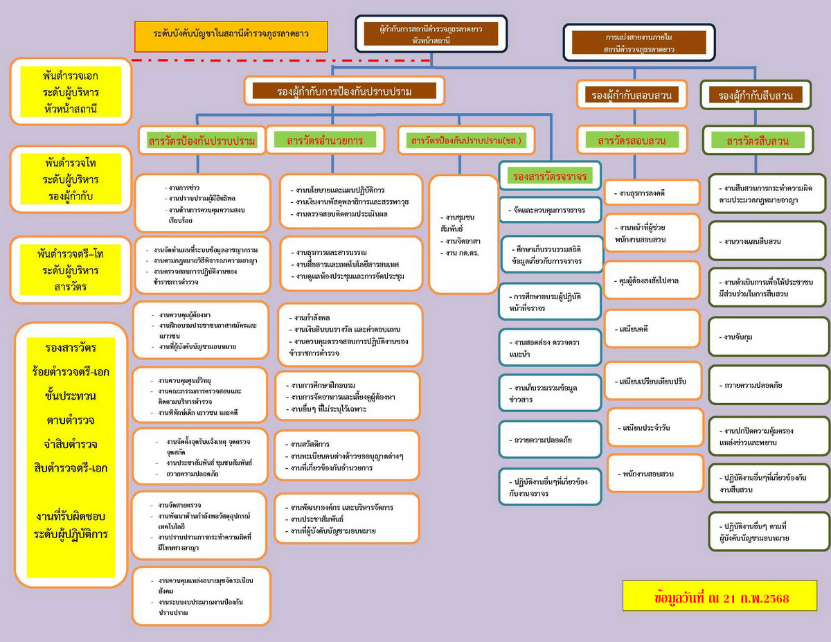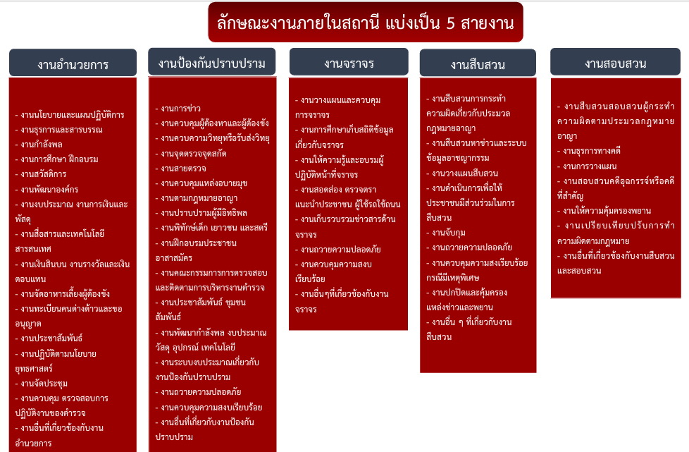 สถานีตำรวจ มีหน้าที่ตามประมวลกฎหมายวิธีพิจารณาความอาญา และตามกฎหมายอื่นอันเกี่ยวกับความผิดในคดีอาญาภายในเขตอำนาจการรับผิดชอบหรือเขตพื้นที่การปกครอง รวมถึงการรับผิดชอบในด้านการงานและการปกครองบังคับบัญชาถัดรองลงไปจากกองบังคับการตำรวจนครบาล(1-9) หรือตำรวจภูธรจังหวัด เพื่อรักษาความปลอดภัยในชีวิตและทรัพย์สิน ความมั่นคงภายใน บริการทางสังคม ชุมชน และมวลชนสัมพันธ์ การพัฒนางานบริหารและงานจเรตำรวจ การป้องกันปราบปรามอาชญากรรมและการรักษาความสงบเรียบร้อย รวมถึงงานกิจการพิเศษ และงานอื่น ๆ ที่เกี่ยวข้องกับสถานีตำรวจ ซึ่งงานในสถานีตำรวจ แบ่งออกเป็น 5 สายงาน ตามคำสั่ง ตร.ที่ 537/2555 ดังนี้1) งานอำนวยการ มีหน้าที่เกี่ยวกับการอำนวยการ การวางแผน การตรวจสอบติดตามและประเมินผลงานที่เกี่ยวกับนโยบาย ยุทธศาสตร์ และแผนงานของสถานีตำรวจ งานการบริหารบุคลากร งานจเรตำรวจงานกิจการพิเศษ งานความมั่นคง การศึกษา การฝึกอบรม งานวิชาการ สวัสดิการ การพัฒนา การบริหารจัดการ งบประมาณ การเงิน การพัสดุ การพลาธิการและสรรพาวุธ การส่งกำลังบำรุง รวมทั้งลักษณะงานอื่น ๆ ที่เกี่ยวข้องหรือเป็นส่วนประกอบของงานดังกล่าว เพื่อส่งเสริมหรือสนับสนุนการปฏิบัติงานของสถานีตำรวจ2) งานป้องกันปราบปราม มีหน้าที่เกี่ยวกับการวางแผน อำนวยการ สั่งการ ควบคุม กำกับ ดูแล ตรวจสอบติดตามและประเมินผล ตลอดจนปฏิบัติงานในด้านการป้องกันอาชญากรรมและรักษาความสงบเรียบร้อยงานคณะกรรมการตรวจสอบและติดตามการบริหารงานตำรวจ งานชุมชนและมวลชนสัมพันธ์ในรูปแบบต่าง ๆ รวมทั้งงานที่มีลักษณะเกี่ยวข้องหรือเป็นส่วนประกอบของงานนี้ เพื่อมิให้เกิดอาชญากรรมขึ้นในเขตอำนาจ การรับผิดชอบหรือพื้นที่ปกครองของสถานีตำรวจ3) งานจราจร มีหน้าที่เกี่ยวกับการวางแผน อำนวยการ สั่งการ ควบคุม กำกับ ดูแล ตรวจสอบและประเมินผลงานด้านการควบคุมจราจร จัดการและบังคับใช้กฎหมายเกี่ยวกับจราจร งานจราจรตามโครงการพระราชดำริ รวมทั้งงานที่มีลักษณะเกี่ยวข้องหรือเป็นส่วนประกอบของงานนี้ เพื่อป้องกันไม่ให้เกิดปัญหาด้านการจราจร ในเขตอำนาจการรับผิดชอบหรือพื้นที่ปกครองของสถานีตำรวจ ตลอดจนพื้นที่ที่มีการจราจรต่อเนื่องกัน4) งานสืบสวน มีหน้าที่เกี่ยวกับการวางแผน อำนวยการ สั่งการ ควบคุม กำกับ ดูแล ตรวจสอบติดตามและประเมินผล ตลอดจนปฏิบัติงานในด้านการสืบสวน อาชญากรรม การกระทำความผิดตามพระราชบัญญัติที่มีโทษทางอาญาทุกฉบับ ตลอดจนองค์กรหรือเครือข่ายที่อยู่เบื้องหลัง รวมทั้งงานที่มีลักษณะเกี่ยว