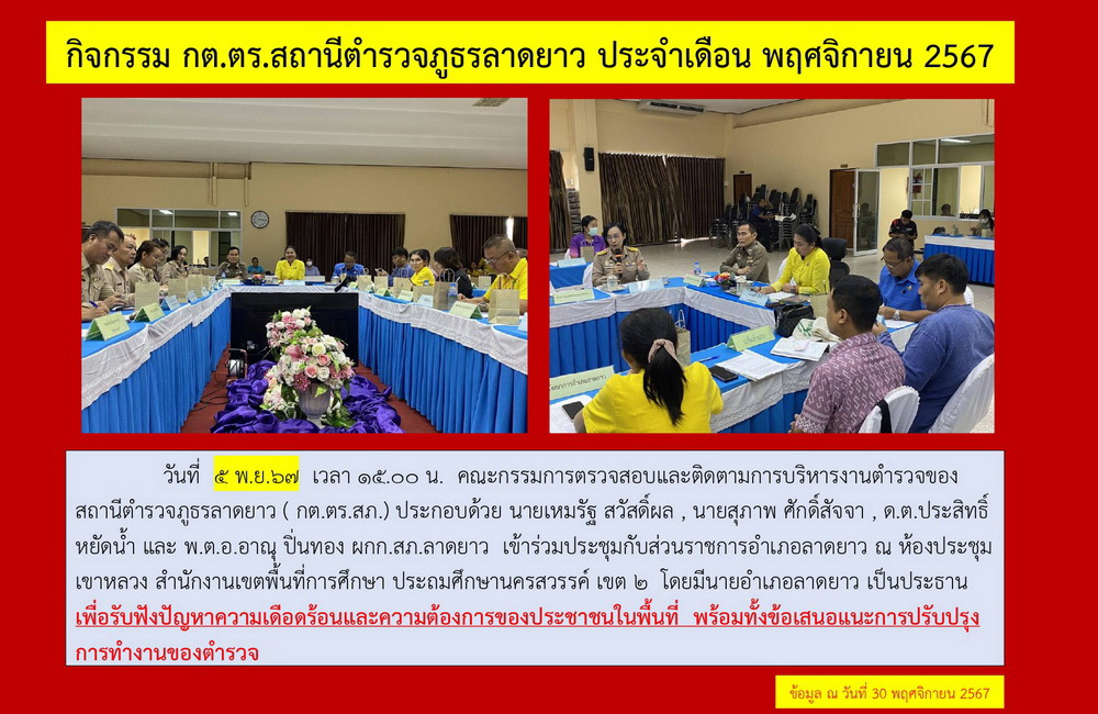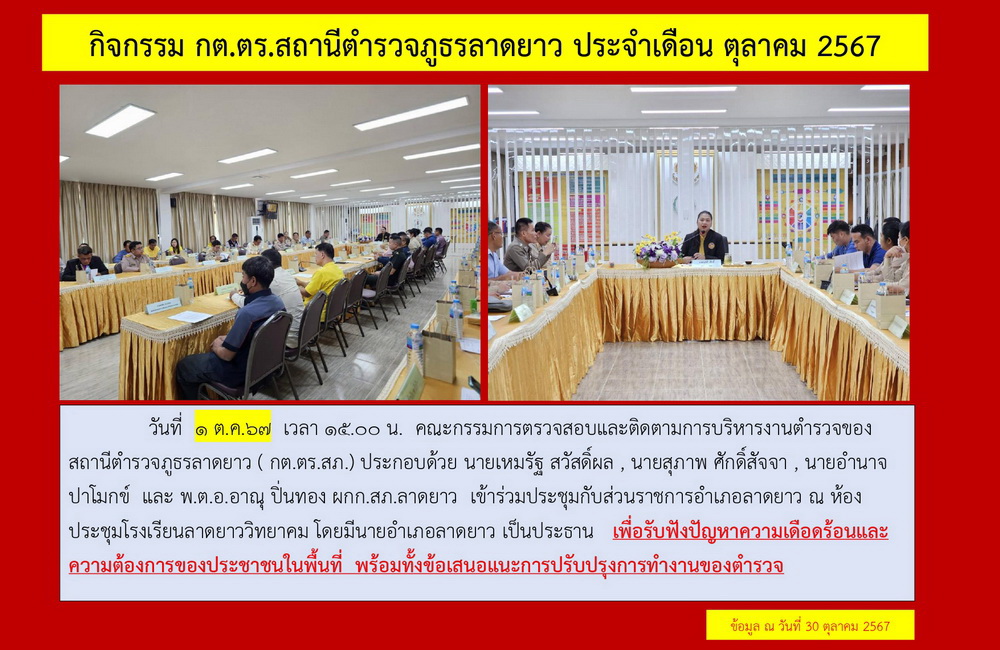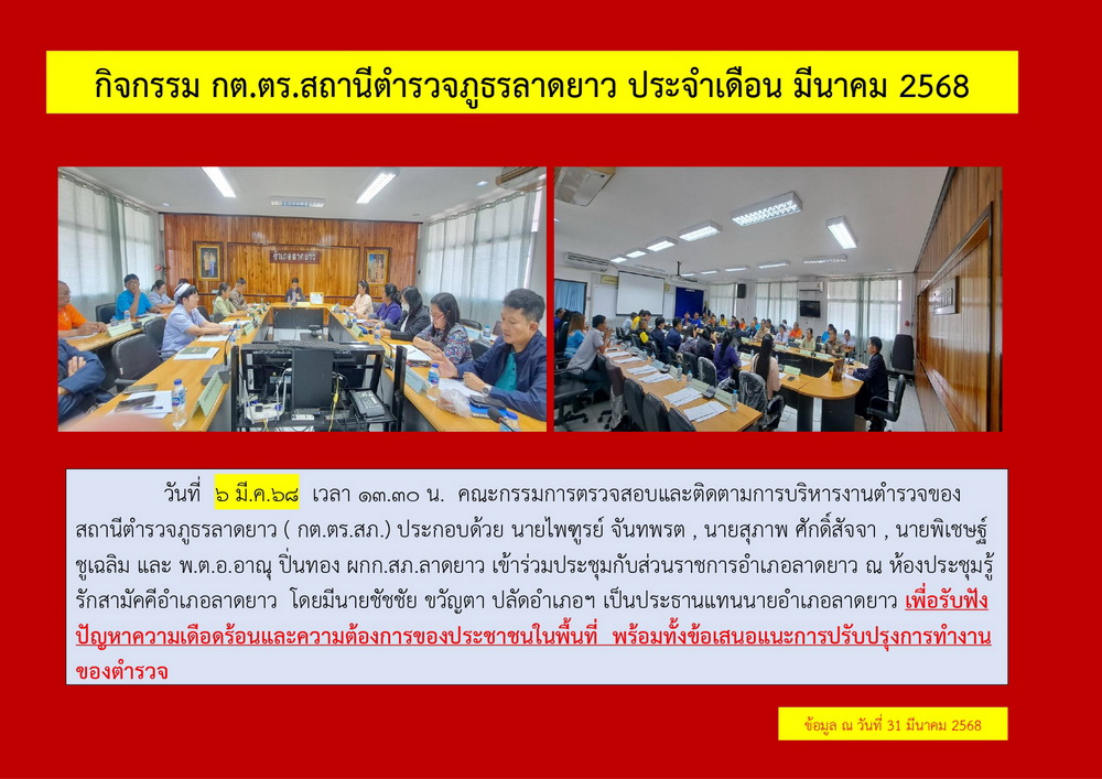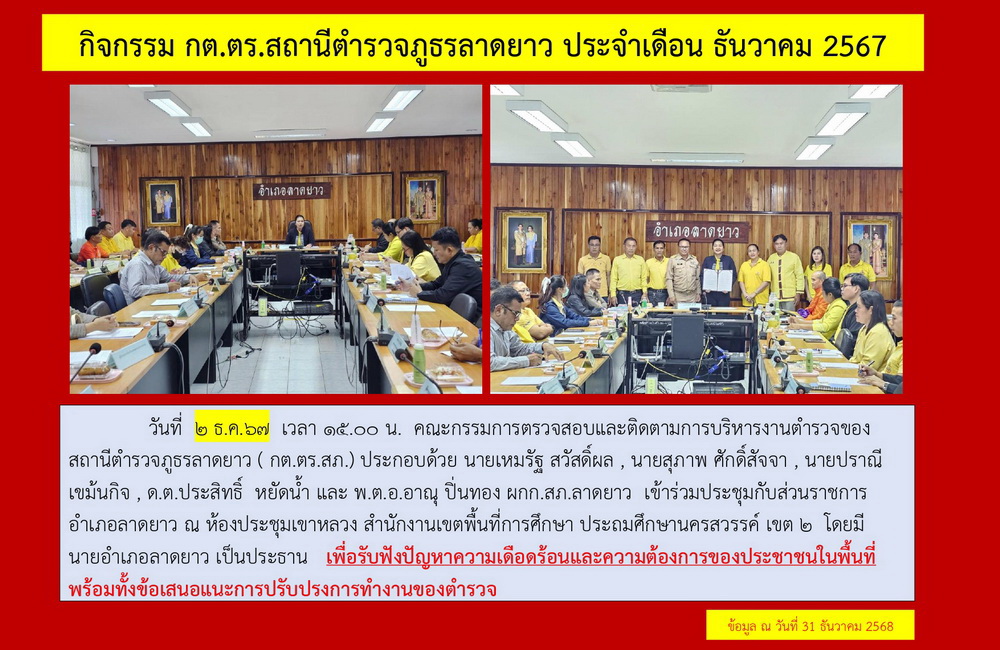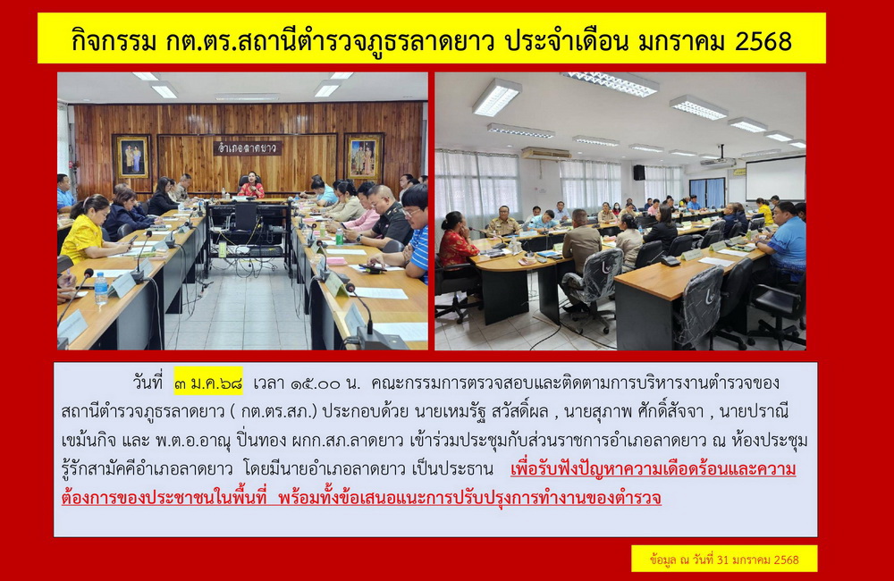วันที่ 11 ก.พ.68 เวลา 14.00 น. สภ.ลาดยาว จัดการประชุม กต.ตร.สภ.ลาดยาว ครั้งที่ 1/2568 เพื่อเลือกประธาน กต.ตร.สภ.ลาดยาว มติในที่ประชุมเลือกให้ นายสุภาพ ศักดิ์สัจจา นายกเทศมนตรีตำบลลาดยาว เป็น ประธาน กต.ตร.สภ.ลาดยาว , พ.ต.อ.อาณุ ปิ่นทอง ผกก.สภ.ลาดยาว เป็นรองประธานคนที่ 1 และนายฉัตรชัย รักทรัพย์ ปลัดองค์การบริหารส่วนตำบลวังม้า เป็นรองประธานคนที่ 2 ได้ร่วมกันแสดงสัญลักษณ์ประกาศเจตนารมณ์การป้องกันและต่อต้านการทุจริตคอร์รัปชั่น ภายใต้แนวคิด ZERO Tolerance คนไทยไม่ทนต่อการทุจริต